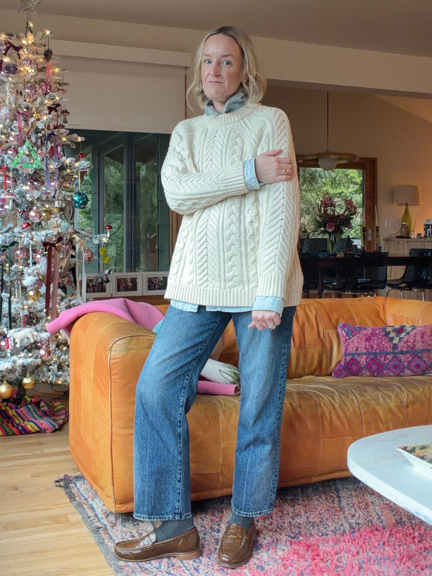 I added my previously mentioned Freda Salvador loafers, my much loved and worn silver heart hoops - although now that I’m looking at Lucy’s earrings enlarged on my computer screen they appear gold - and my old Rag & Bone fisherman sweater that is quickly becoming a renewed favorite of the season