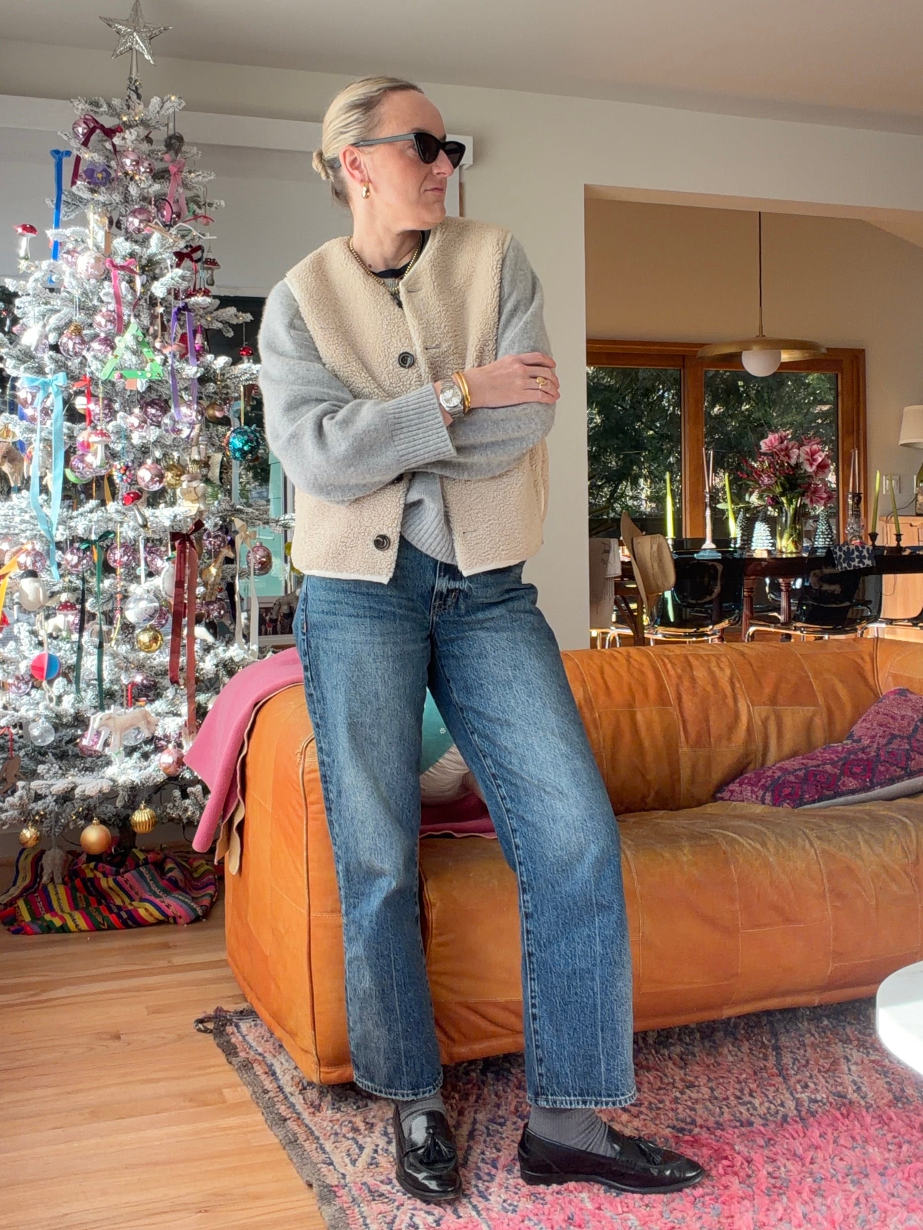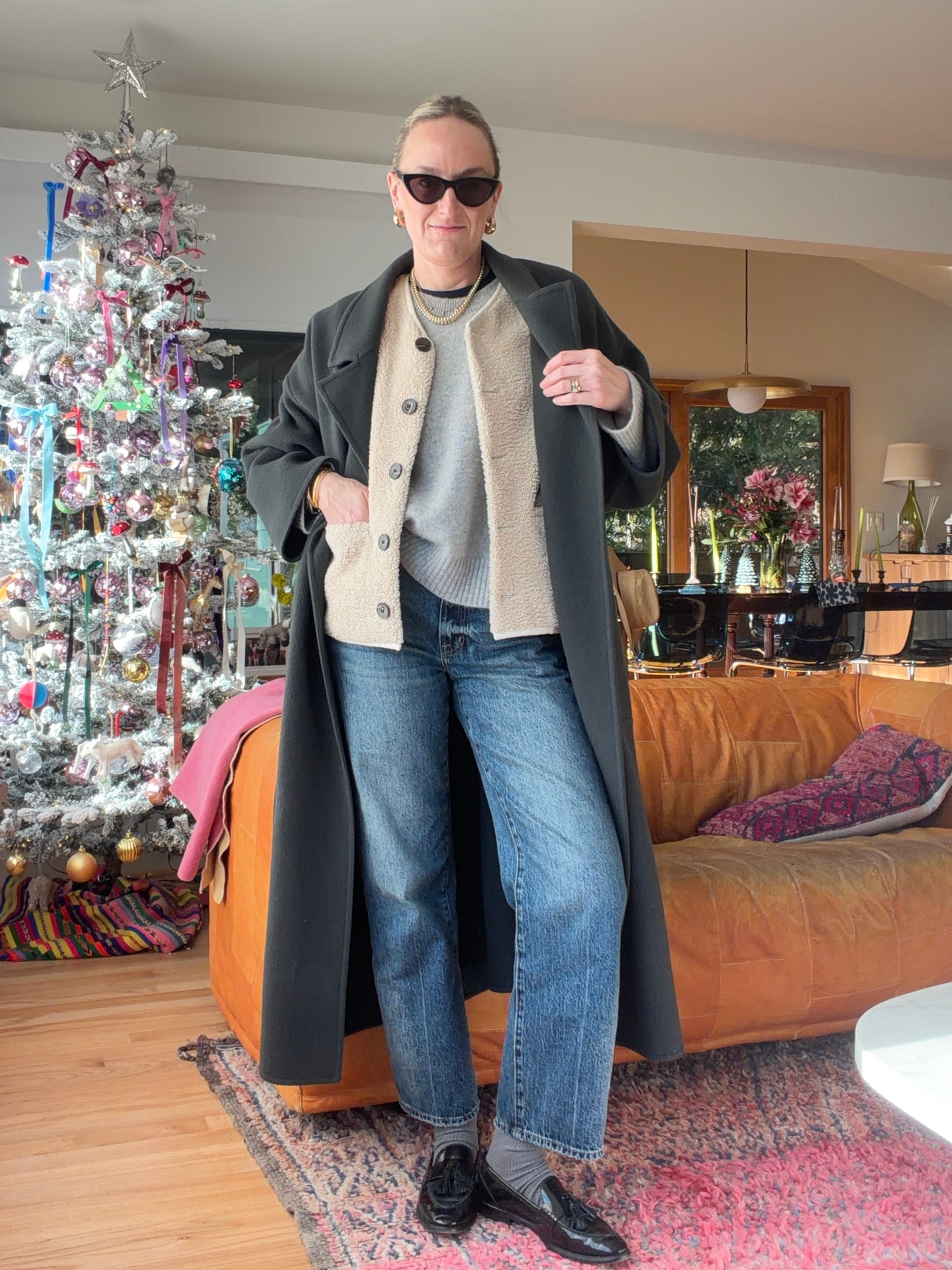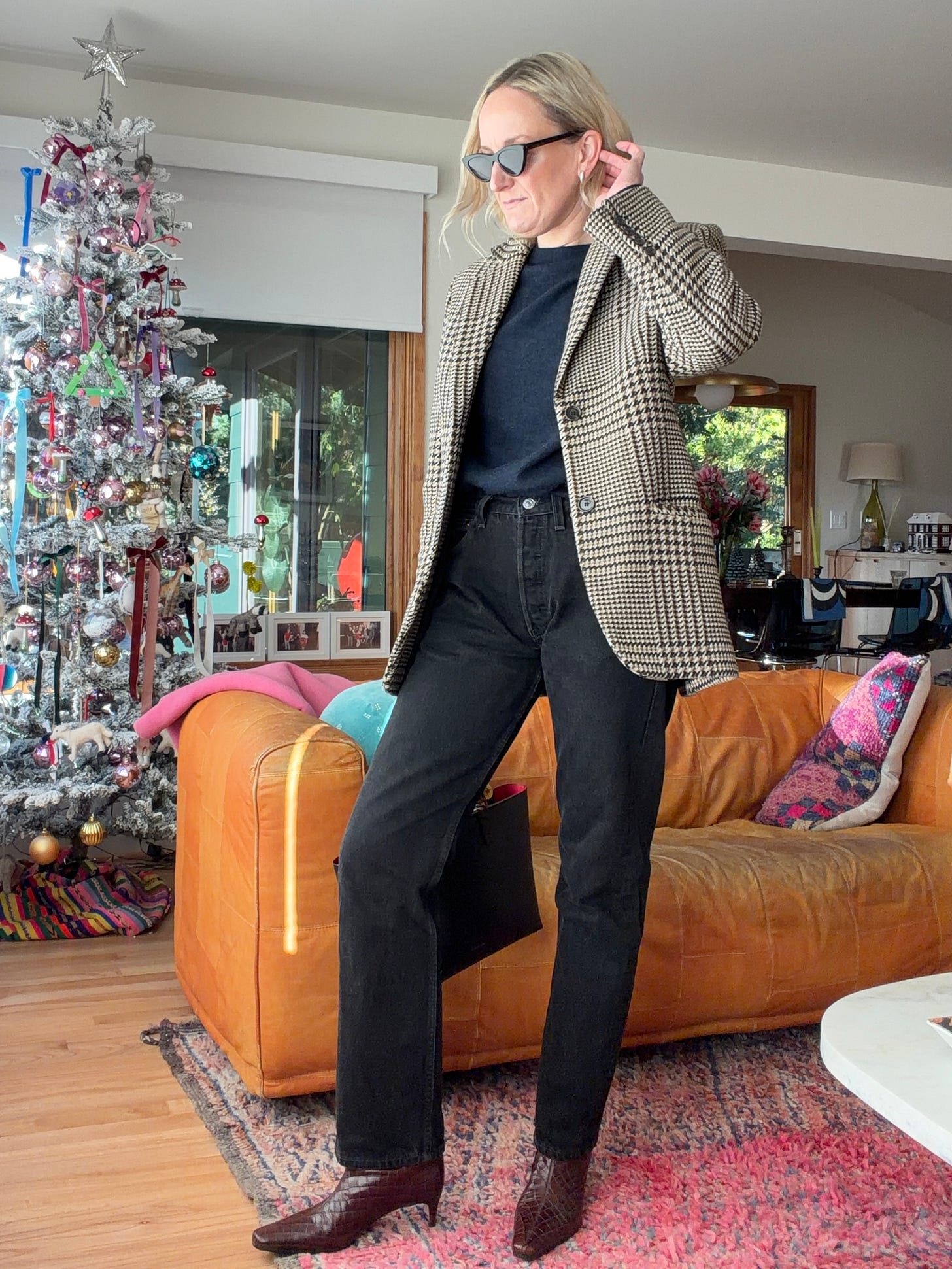 I pulled out my new-ish to me black vintage Levi’s that I’ve had some trouble styling, my often worn plaid blazer, and wore my Tercette sweater*, backwards again, as I don’t have a crewneck to steal from my husband just yet. In an unhinged Black Friday moment, I ordered me and my family coordinating - but not matching - monogrammed sweaters in shades of blue for Christmas. Well, technically my husband, my oldest, and I have shades blue with red monograms and my youngest is getting a red sweater (at his request) with a blue monogram. Look out for the photographic evidence on Christmas day.