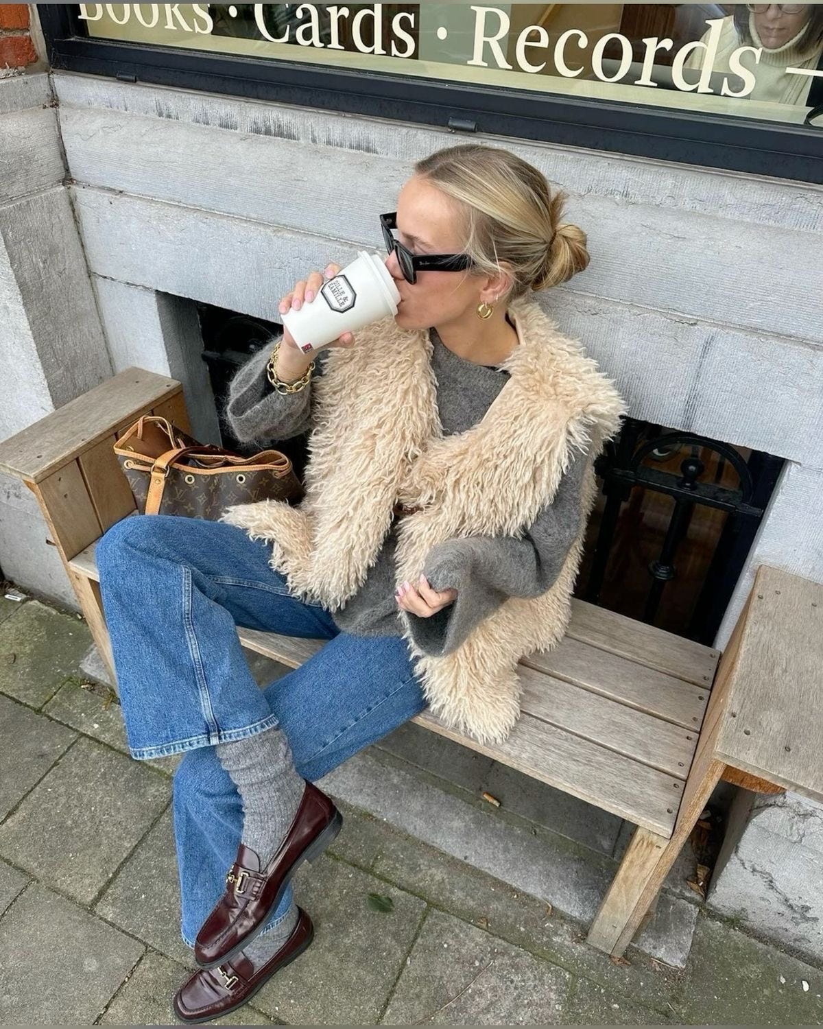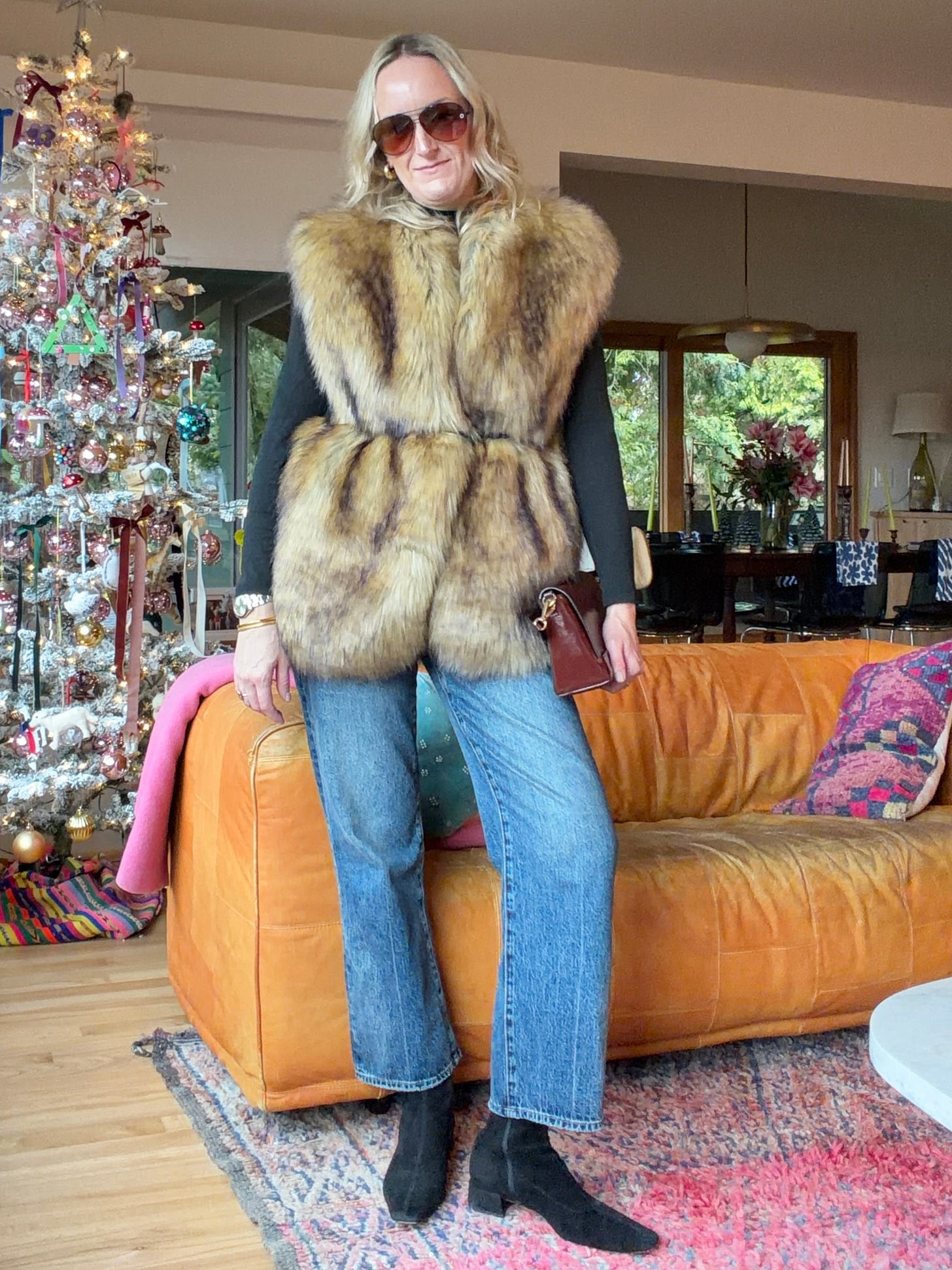 I knew I wanted to recreate this outfit the minute I saw her post last week. Because, as seen above, I do have a giant furry vest. I also have lug sole boots that feel very similar to hers, but I opted for my suede boots with a slim toe because I wanted to go a little dressier for my workday. My camel sweater felt too oversized - I really liked the balance of her slim sleeve with the voluminous vest - so I wore my new favorite turtleneck instead. I would have preferred sweater in a tone closer to that of the vest for a lower contrast look, but I’m never mad at black and brown, or any neutrals, worn together.