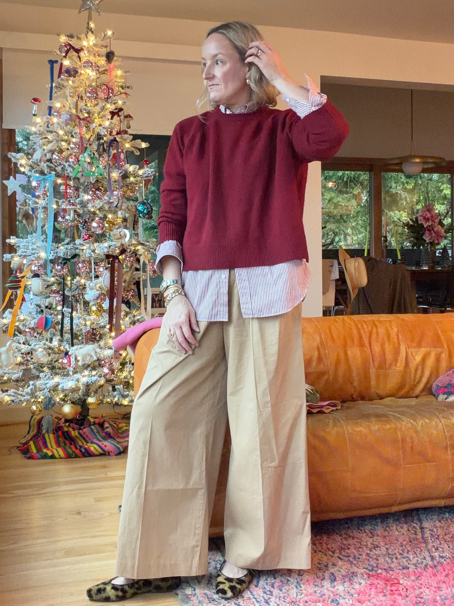 At first I worried that my interpretation wouldn’t be as successful as I don’t have a red striped button up shirt, and I think the monochrome moment is really a big part of what makes the look. But then I remembered I have a 12 year old who went from a kids XL to Adult L in the span of 18 months and left a trail of holiday hand-me-downs in his wake. I snuck into his hovel, I mean room, while he was at school and snagged his only-worn-once burgundy striped button down in a men’s size medium. A relic from Christmases past, aka last year.