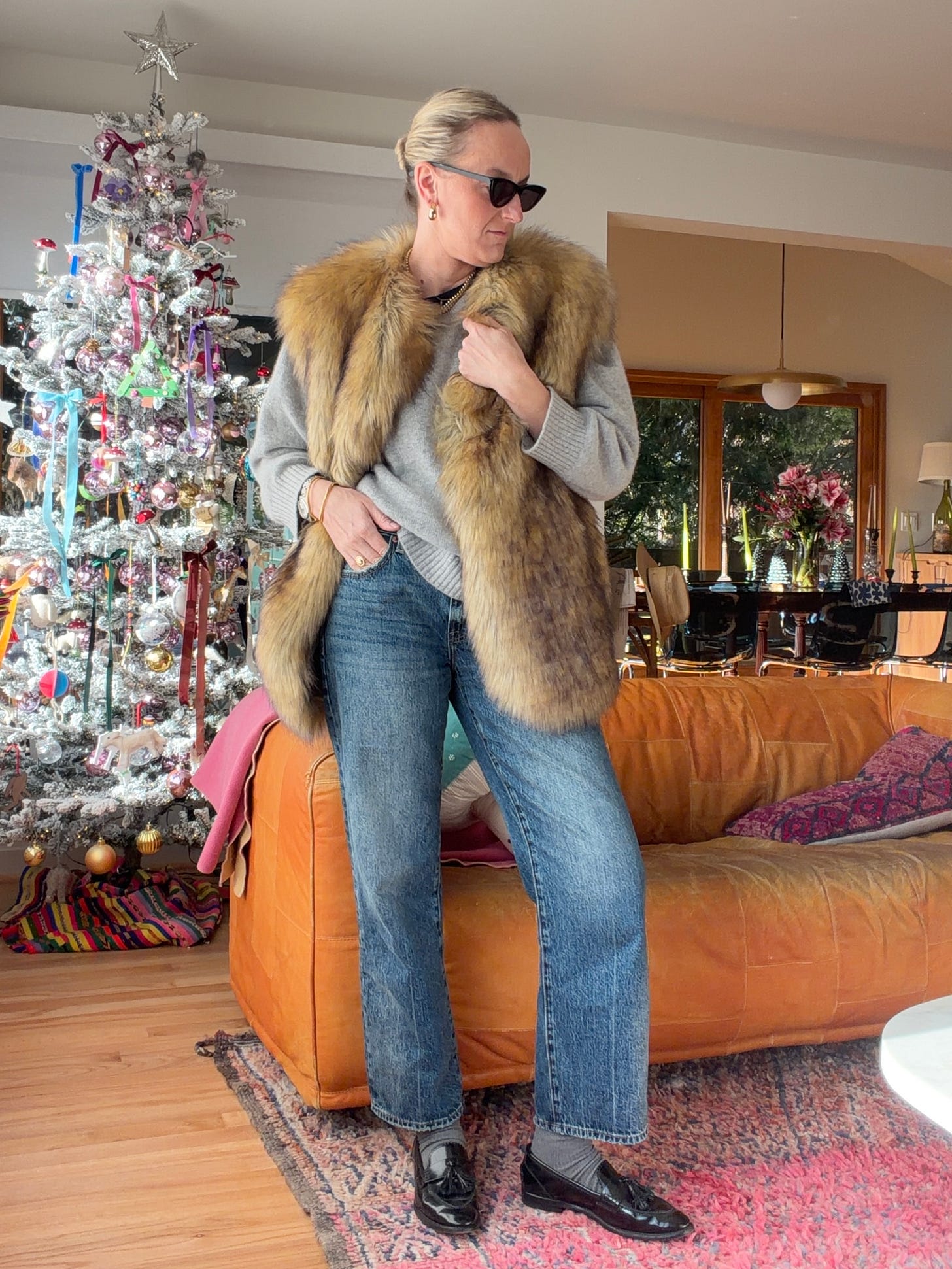 In all honesty, I’m fighting for my life in these pic, following a night of dancing and drinking in semi-formal attire at our annual holiday dinner dance. But Santa must persevere. I ended up swapping the vests out and adding a coat for my afternoon of errands. Does this count as a groutfit Tina Boetto?