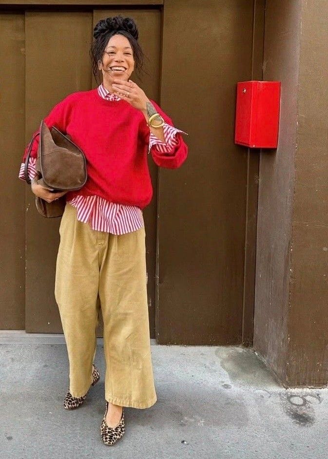 I’d forgotten that I saved the outfit above, and have a renewed obsession. The volume of the pants! The matching stripes and sweater, with the tucked collar and the sleeves pushed up just so! The leopard shoes! The gold cuff! Her smile! I initially saved the image in the fall, and it’s definitely a warmer weather look, but theres nothing a good coat, and maybe a hat, can’t fix.